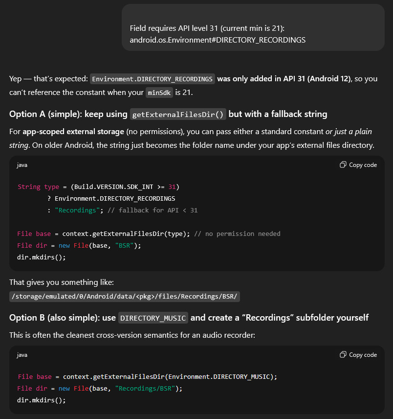 Следующее, над чем хотелось поработать - это наладить выгрузку на Google Drive. ChatGPT сначала сказал, что та методика (Storage Access Framework), которую я использовал для выгрузки на SD карты и в общие папки, может быть использована для выгрузки на Google Drive без прямого обращения к Google Drive API. Как оказалось - это не так, по крайней мере на моём телефоне. Выгрузить на Google Drive через SAF не получилось - выбрать можно было только файловые папки из памяти телефона. Решил всё-таки проверить как работает выгрузка на SD карты, и обнаружил, что выбор папки для выгрузки не сохраняется. Фактически, выгрузка на карты работала только один раз, и при следующем запуске приложения приходилось выбирать папку заново. ChatGPT помог решить эту проблему - сказал сразу что куда нужно добавить, чтобы запрос на доступ к папке был перманентным. Проверил, теперь работает надёжно. Выбираете папку в общем хранилище или на SD карте - и записи будут уходить туда. После перезагрузки приложения всё так же работает.